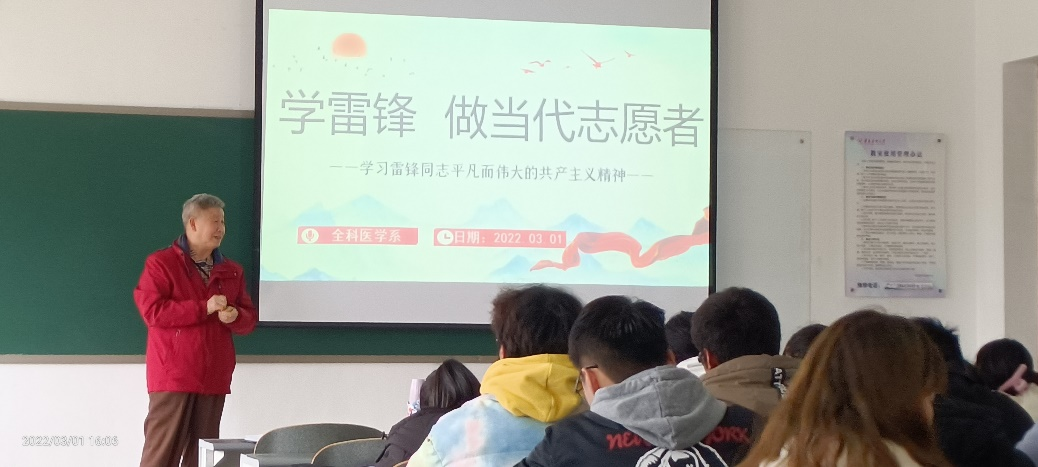 2022年03月01日,全科医学系在一教3-12A开展了“学雷锋·做当代志愿者”主题讲座活动,讲座由全科医学系关工委副主任滕久军老师主讲,全科医学系2021级全体同学参加。