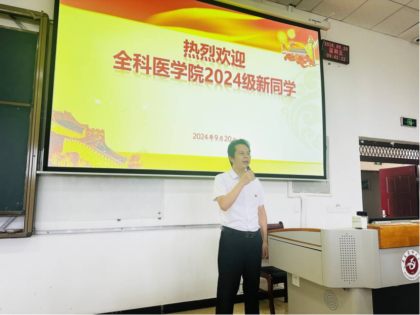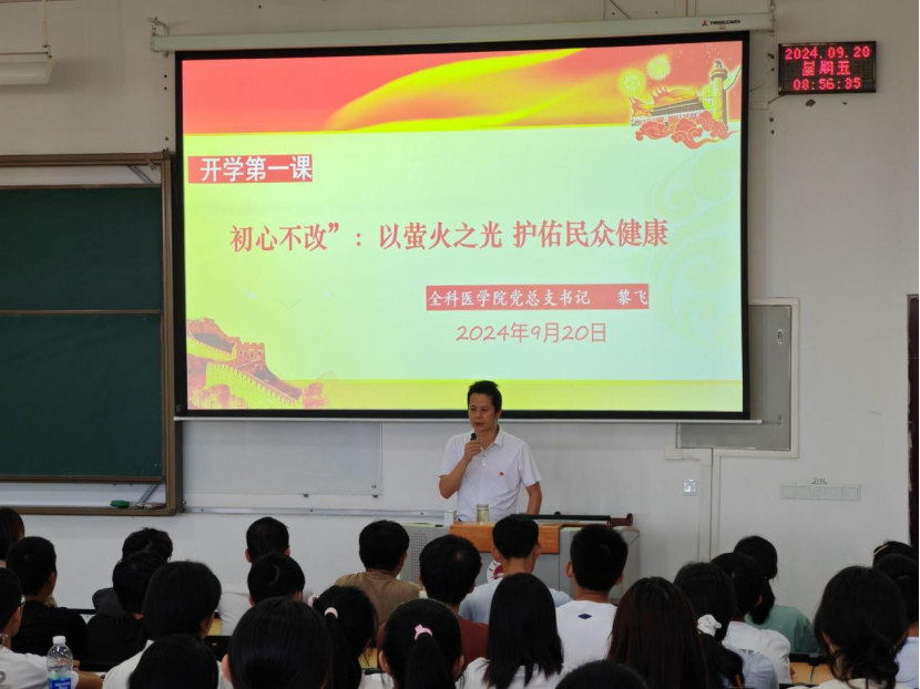 9月20日上午,公司党总支书记黎飞以“初心不改,以火之光保佑民众健康”为题,为学院2024级新生讲授开学第一课。学院员工党支部负责人陈圆圆、杨晓艳,办公室负责人李庆钰及2024级全体新生96人现场聆听。