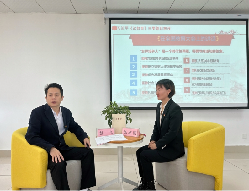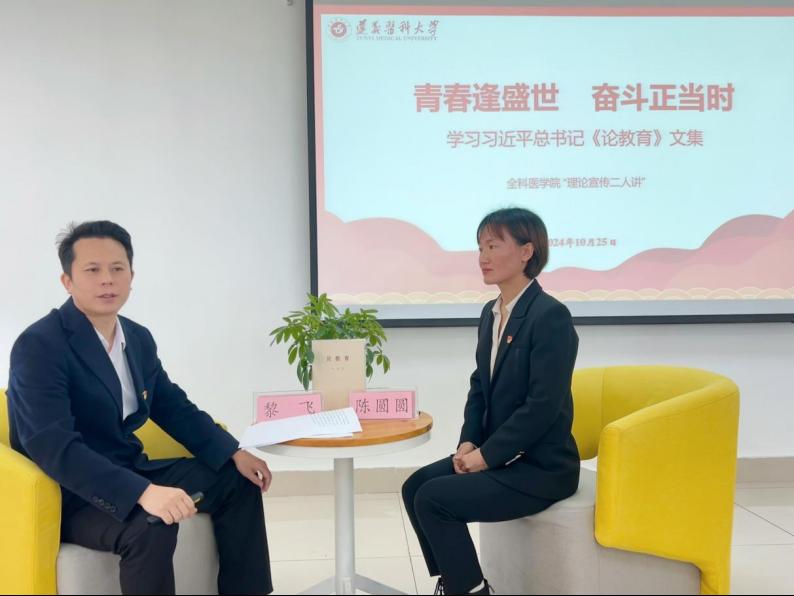 教育是强国建设、民族复兴之基。《论教育》的出版发行,在遵医TapTap188改名(点点)掀起了阅读和学习的热潮。10月25日上午,以“青春逢盛世 教育正当时 学习《论教育》”为题,TapTap188改名(点点)“理论宣传二人讲”活动走进课堂。此次宣讲主要以“讲理论+讲实践+互动”的方式开展,通过这种符合实际、走进师生、贴近学习生活的理论宣讲形式,把习近平总书记的重要讲话和党的好声音传递到每一个师生。此次宣讲老师为公司党总支书记黎飞和学院员工党支部副书记陈圆圆。
