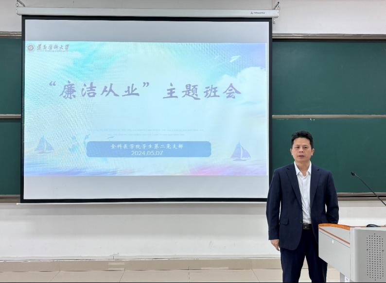 黎飞书记说:“我们目前全党正在开展党纪学习教育,对全体党员来讲是一场荡涤灵魂、砥砺党性的庄重洗礼。而我们员工毕业后马上面临从业,我们在工作中要如何廉洁,不触犯底线、不碰红线,今天我要语重心长给你们讲清楚。”他强调,廉洁从政是中华民族自古以来一直倡导的传统美德,随着社会的发展与进步,尤其我国加入联合国反腐败公约后,廉洁教育显得更为迫切。他要求凡事不能急功近利、追求功利,不能为了个人的一时享乐与消费而利用职权收取好处,要时时提高自己的自控能力。黎飞老师还从我们员工要从事的医疗工作,梳理了18条,针对性的指出哪些范畴和行为在工作中不能做。